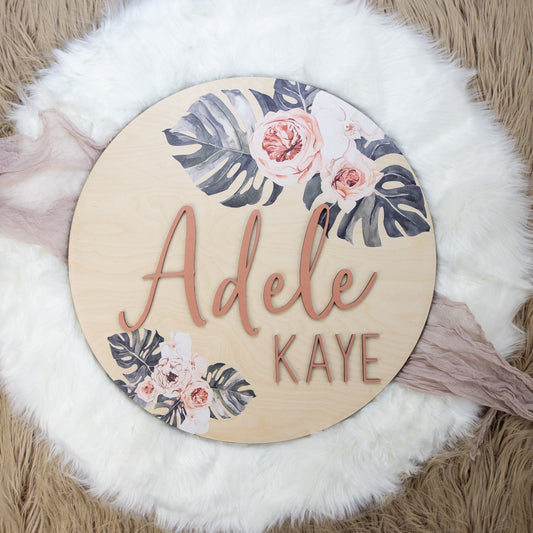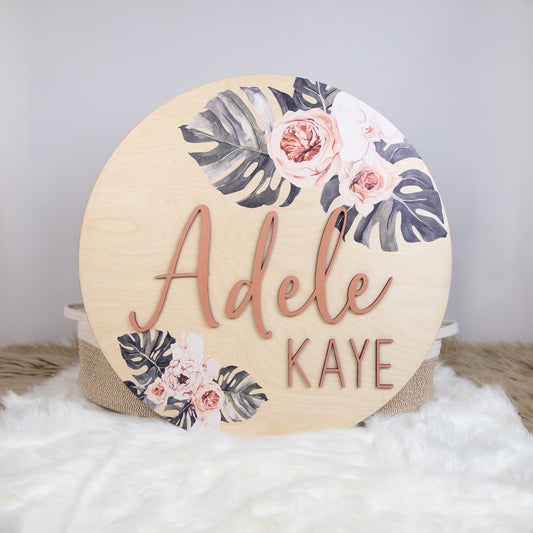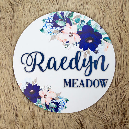 Round 3D Wood Nursery Name Sign, 15-24 Inch Navy and Blush Floral