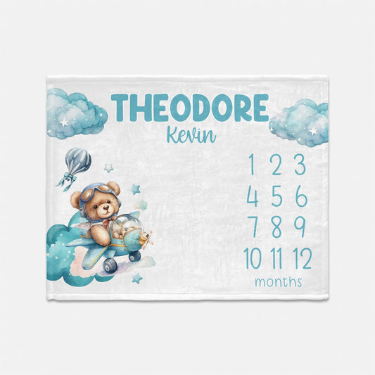 Boy Bear Pilot and Airplane Baby Milestone Blanket, T62