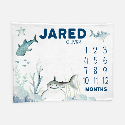 Shark Baby Boy Milestone Blanket, Ocean Marine Life Nursery O32