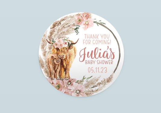 Highland Cow Baby Shower Favor Stickers, Boho C21