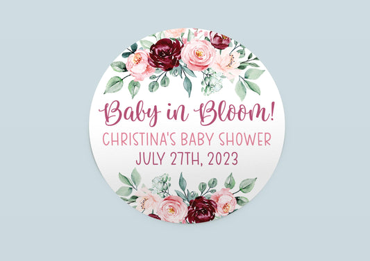 Floral Baby Shower Favor Stickers, Burgundy and Blush F25