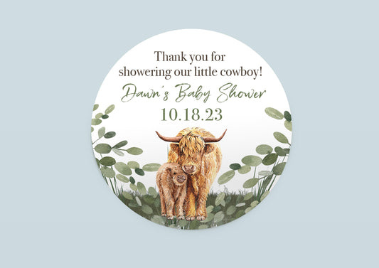 Highland Cow Baby Shower Favor Stickers, Boho C19