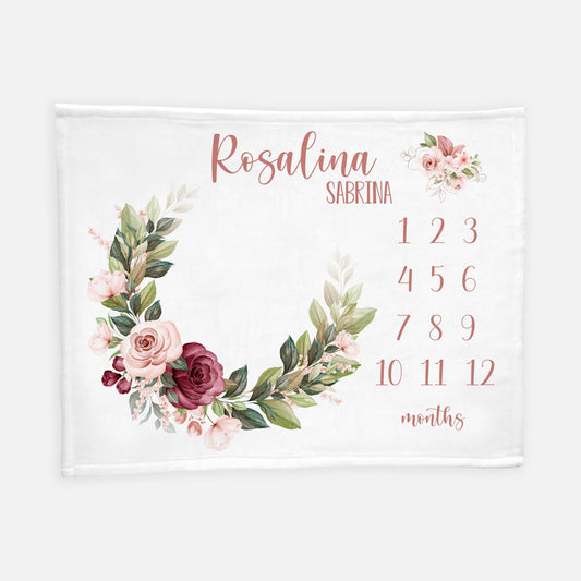 Burgundy and Pink Floral Baby Milestone Blanket, F87
