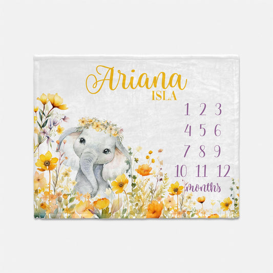 Elephant Yellow Wild flower Baby Milestone Blanket, S69