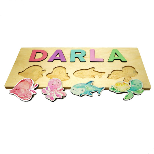 Ocean Life Wood Name Puzzle, Fish Octopus Shark Turtle