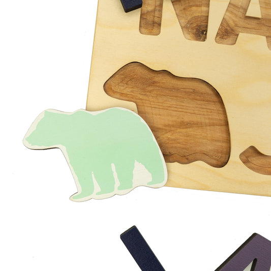 Mountain and Bear Wooden Name Puzzle, Mint and Navy
