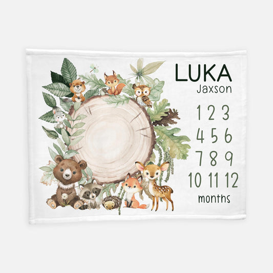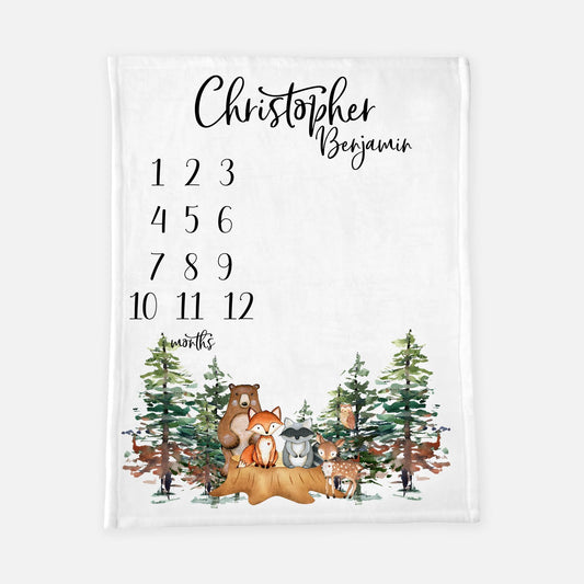 Woodland Milestone Blanket, Baby Boy Raccoon Bear Deer Fox Blanket, W1