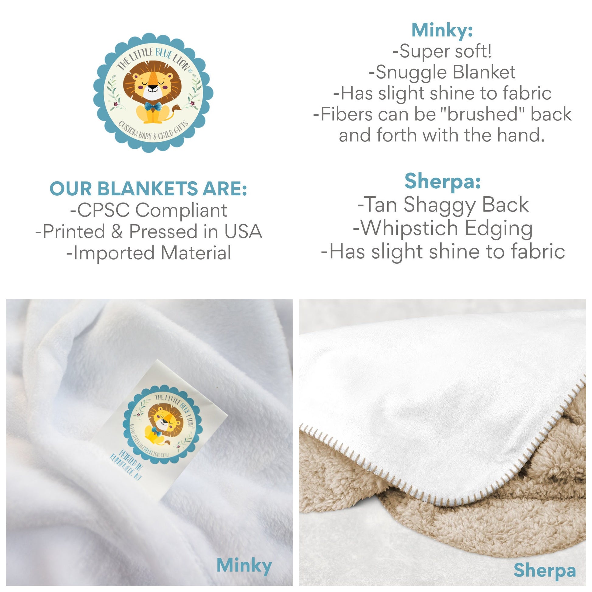 Blue Lion Baby Co.® personalized super soft Minky or Sherpa blankets are the absolute perfect gift for any beautiful newborn baby! Track their growth with monthly milestone photos on either our 30x40, 40x50 or 50x60 blankets.