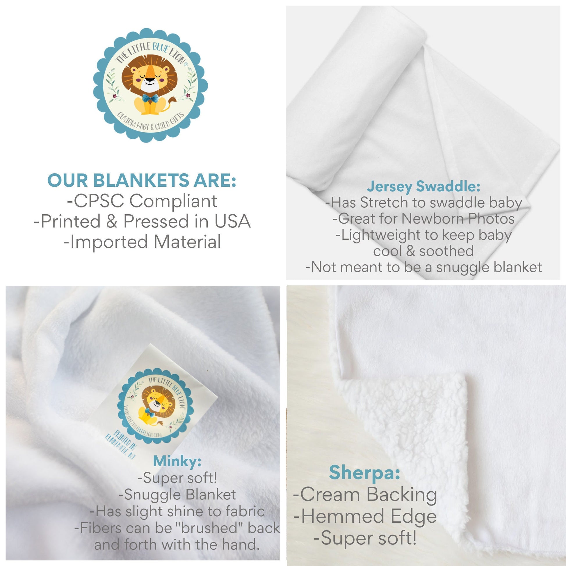 Larger Blanket sizes are available if desired in 40x50, 40x60, 50x60 or 60x80. Please message us for a blanket upgrade listing to add-on.